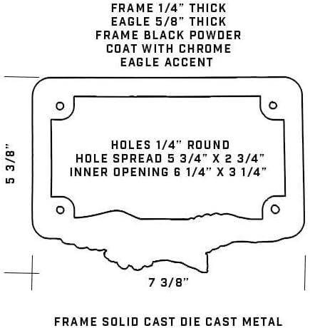 Show Chrome Metal Frame & 3D Eagle Emblem Motorcycle License Frame + Locking Stainless Hardware Kit Product Features Die Cast Metal Construction Chrome & Black Powder Coat Finish 3D Eagle Accent Custom Appearance For USA Standard 7 x 4 License Plates Universal Fit For Most Applications Fasteners Stainless With NyLoc Nuts + Washers Overall Product Measurement 5 3/8" Tall X 7 3/8" Width X 5/8" Depth (Eagle) 1/4" Depth (Top Black Part Of Frame) Standard 5 3/4" x 2 3/4" Hole Spacing With 1/4" Holes Inner Opening 6 1/4" Wide x 3 1/4" Tall Durable Construction For Years Of Trouble Free Use TECH NOTES: Please Confirm These Details Prior To Purchase Please See My Store For More Custom Logo Products