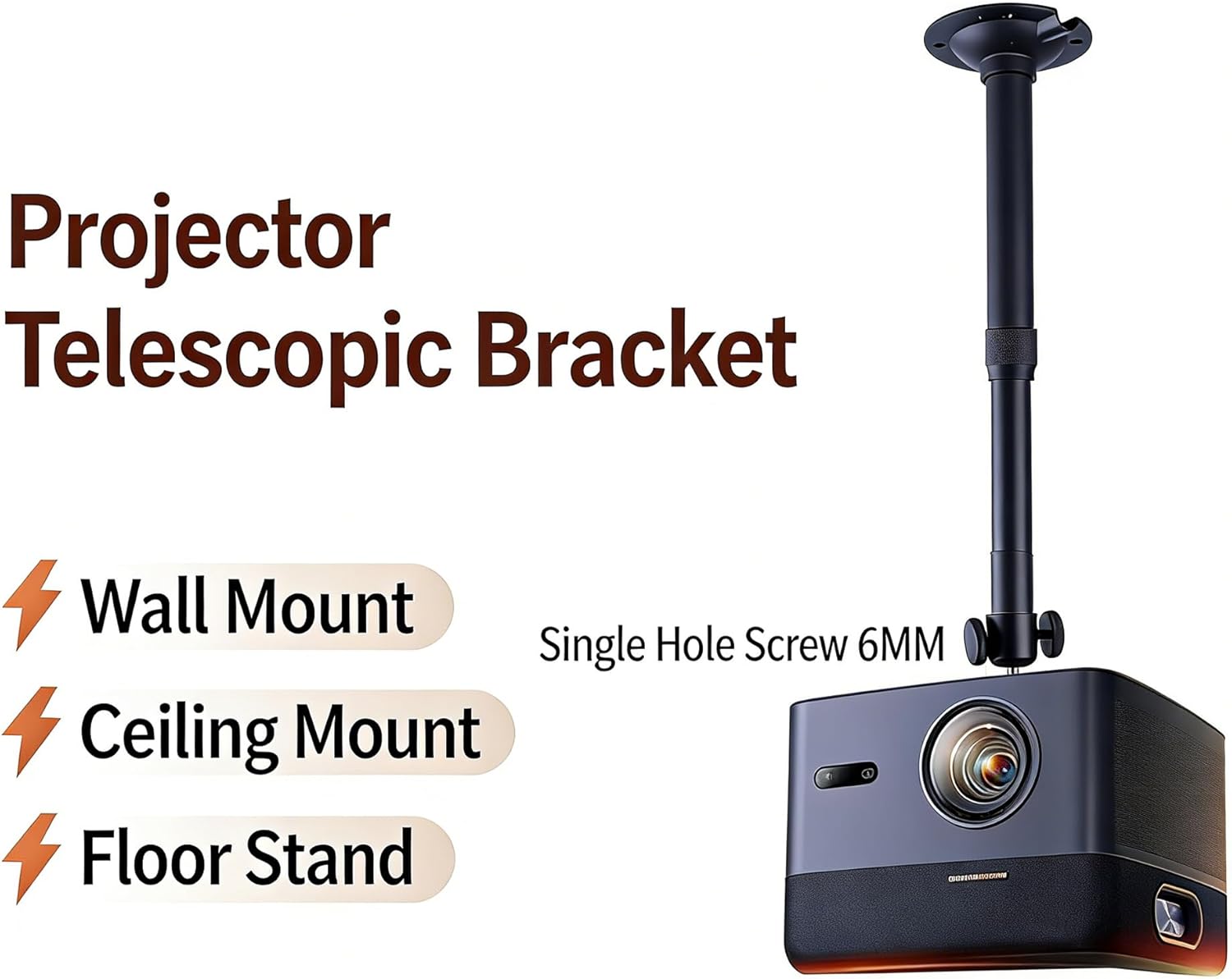 Our universal projector ceiling installation solves compatibility issues - designed for 4-hole VESA standard projectors (75x75/100x100) and single hole models, this is the only installation you need in your home, office, or classroom settings. This bracket is made of aluminum alloy and features an adjustable length rod (with a telescopic design that allows you to customize the height to fit the distance from the ceiling to the screen) and a detachable 4-wire base: connect to a standard projector's 4-hole board or replace with a smaller/non VESA device's single hole adapter (using 6mm screws). It takes a few minutes to install using the accompanying hardware, and the sturdy structure can support up to 22 pounds (10 kilograms) of weight, which is stable enough for most home theaters and office projectors.